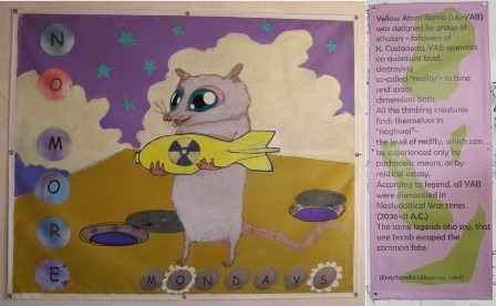 Autorius pasirenka dvi tarptautines kalbas – lotynų, kuri iki XIX a. buvo išsilavinusios Europos kalba, ir anglų – universalią šiandienos kalbą. Postmodernistų pamėgtas lingvistinis aspektas parodai suteikia savitumo, leidžia tiksliau ir gyviau išreikšti autoriaus poziciją. Tačiau į akis krinta autoriaus neraštingumas – rašybos klaidos tiek paveiksluose, tiek parodos anotacijoje. Gal tai yra tyčia surežisuota raiškos priemonė?