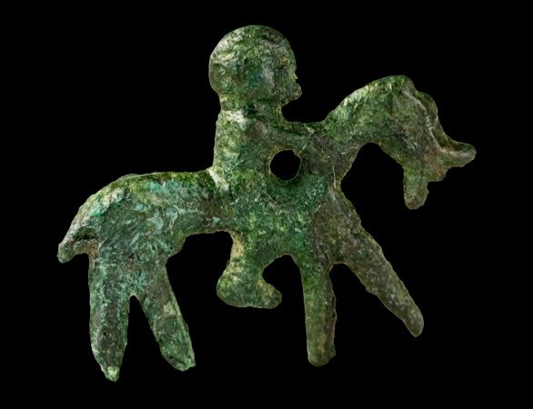 Kalbant apie žirgus ankstyvajame Lietuvos mene, artefaktų nėra gausu. Mes negalime didžiuotis įmantriomis freskomis ar puikiais metalo ir keramikos dirbiniais. Pagrindinis šaltinis tėra įkapės, pvz., medalionai, kamanų papuošimai, segės ir kt. V–VI a. baltų lankinių segių formose pasirodęs labai transformuotas ir schematizuotas žirgo galvos motyvas išsilaikė iki XI a., o pasaginėse segėse – net iki XVII a. Baltiškos segės rodo vienu metu egzistavus dvi skirtingas estetines programas: įmantraus, susipinančio, primenančio zoomorfines figūras ornamentinio stiliaus ir minimalistinę, norimą zoomorfinį pavidalą suteikiančią paprasčiausiu būdu[32]. Be to, žirgo ir slibino dvilypumas atsiskleidžia metaliniuose žąslų laužtukuose (XI–XII a.), rastuose Veršvuose, Marvelėje, Graužiuose, Rusių Rage. Graužių kaulinis laužtukas zoomorfine galva primena Semboje, Dolokaimio paminkle, aptiktą papuošalą. Kadangi Graužių laužtukas pagamintas vietoje, tad jame greičiau reiktų ieškoti žirgo simbolio, <...> tai patvirtintų ir pasaginių zoomorfinių segių, ir Didvyčių kabučio žirgo galvos apipavidalinimas[33]. Kita vertus, vienintelis raitelį vaizduojantis plokščias kabutis (XI–XII a.) rastas jau minėtuose Didvyčiuose. Tai gana elementarus raitelio atvaizdas, tiksliau, jo siluetas, kuriame neįmanoma identifikuoti nei raitelio bruožų (numanoma, kad tai karys), nei gyvulio kamanų puošybos. Žirgo pavidalo kabučiai dažni radiniai baltų, finougrų ir slavų paminkluose, o raitelio atvaizdas žinomesnis Skandinavijos vikingų laikų dailėje[34]. Taigi neatmetama prielaida, kad minimas kabutis galėjo atkeliauti iš Skandinavijos. Be visų šių artefaktų, žirgo motyvo populiarumą rodo žirgelių figūrėlių ornamentas, įspaustas ant peilio makštų apkausto, rasto Genčių I kapinyne (X a.). <...> Dar ankstesnė žirgelio pavidalo kamanų grandis žinoma iš Aukštkiemių kapinyno[35]. Žirgelių galvos taip pat matomos ant sidabrinės paauksuotos auskarų poros (XIII–XIV a.), rastos Kernavės kapinyno 133 moters kape. Įdomu, kad auskarai labiau slavams būdingas papuošalas, tačiau šis radinys dekoruotas tokiomis pat galvomis, kokios vaizduojamos baltų pasaginėse segėse ir žirgų pavidalo kabučiuose[36].