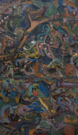 Aušra Barzdukaitė-Vaitkūnienėwww.kamane.lt 2008 06 27 A.Vaitkūnas. "Cosmos of Samogitians", 1988, canvas, oil, 171x100 cmWhile speaking with Živilė Ratavičiūtė, who wrote an article about him “Longing for Truth and Archaism”, in 1993 Arūnas emphasised that his attraction to Samogitia has remained: “Real things exist there. This is why I go to Samogitia when I long for truth and archaism.”He constantly came back to Samogitia. Once Arūnas and the painter Eugenijus Varkulevičius lived in Beržoras, in the home of Julytė Gadeikytė. Eugenijus stayed there earlier already. He painted improvisations of Beržoras church stations. Then Arūnas came. He started painting copies of stations here. He used to help Julytė with her house chores, chopped wood.Later, after about ten years, Julytė wrote a letter to Arūnas: “I wish to your family cosy and sunny days; if sometimes a shadow overcasts the sun, do not fear, it will shine even brighter after the shadow goes away. I wish you, Arūnas, and your wife light daily mood. If you plan to write to Eugenijus, please remind of my concern about the paintings that he has left here. They are at my home, but I am not sure how long I will be able to look after them. My days are coming to an end. Where shall I place art? Ask him to write me. Once again: be happy and healthy, healthy and happy. Truly yours, J. Gadeikytė. P. S. Pardon me for my writing and mistakes – the eyesight is weakening.”Julytė was the lighthouse of Beržoras. She tidied up and maintained the church. Justinas Mikutis also used to stop by in her house near the road and the church. It was him, a Samogitian, who showed us, painters, real art treasures in Samogitia.Arūnas use to remember: “Justinas showed Samogitia to us. He took us to old wooden churches and made us watch stations. We looked at the painting but did not see it at the beginning. Justis opened our eyes – we felt the painting itself. It seems to be banal but in fact it has such strong composition! The stations are of a strange composition in Beržoras, they are grey, no red colour is used. The Christ in grey clothes seems to be standing on the cross rather than to be crucified. The trips with Justis were beautiful.”E.Varkulevičius, Arūnas, Algė Stankutė, Justis, painter Audrius Naujokaitis used to discuss about the meaning of art and existence at the table in Julytė’s home. J. Mikutis cited Boris Pasternak, Mandelstam. After sleeping on the hay, they set on trips. They walked from Beržoras via Plateliai to Gintališkės church speaking about painting, art and belief again.They walked from Beržoras to Žemaičių Kalvarija, Seda. They visited Gegrėnai church with a strange cross in which a symbolic sign of a fish is present. They spoke with the priest in Šateikiai, visited the native village of V. Mačernis - Šarnelė. They saw the big stone of Barstyčiai.Arūnas knew all these routes by heart. He remembered in which church the confessional with interesting paintings or a painting of strange colours was. He filled notebooks with drawings of folk sculptures, sketches of met people while travelling. Sometimes he marked combinations of colours or put down what the colour of one or another object was.Samogitia was a kind of spiritual refreshment to Arūnas in search of authenticity. All these trips enriched his paintings with new motifs and colours.