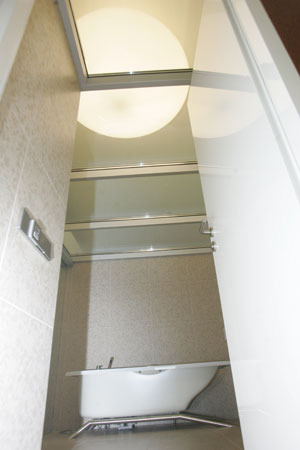 Roof slopes and an impressive chandelier is visible through the glass ceiling in the bathroom. Photo by L.Brundza.