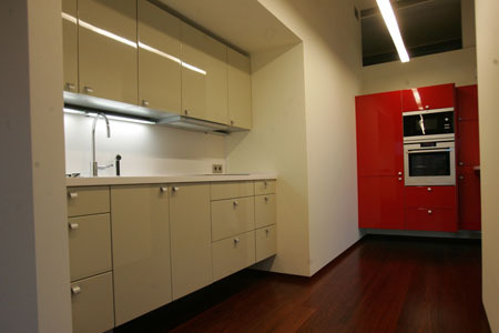 The kitchen interior is livened up by a red accent. Photo by L.Brundza.