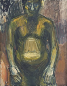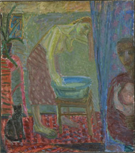 It is the world of painting in which the burden of human life and its meanings open up. Everything is deep and serious: sleep (“Sleeping Boy or St. John’s Sleep”, 2006), observing one’s body (“Woman in the Bath”, 2009), sitting at a table, which becomes a sacral drama (“Last Supper. Apostle. 2009). The paintings of E.Velaniškytė spread the important message to the contemporary man that there are some lasting things which should not be changed in life, even though they are sometimes depressing and hard to bear. Hard situations are sublimated in dark paintings; hardships are regarded with dignity (“Teenager’s Mother”, 2008). Heroines of her paintings have features of self-portrait. They reflect and know the truths for which one should live.