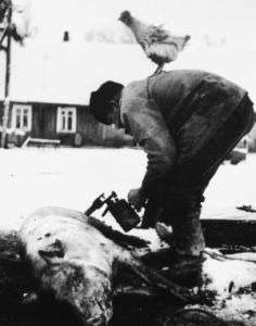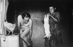 Looking at photographs of R. Vikšraitis, the viewer feels like participating in a pig slaughter described by Sigitas Parulskis in the essay “Killing”. The return to the village, to one’s roots and the dirt present there, which may not be washed by any detergents from hands and heart, leave a trace in the sub-conscience. Looking at photographs of R.Vikšraitis we realise that we do not want to see what is shown to us and to accept the dark reality. Lithuanians close their eyes.