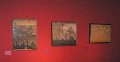 Generally, the exposition looks fresh and impressive. The warm red colour of walls of the exhibition hall surprises at the beginning, but later it becomes clear that the decision of Italians to present paintings of M.K.Čiurlionis in the purple background is very professional. The red contrasts with the prevailing green and yellow shades of paintings, and the deep violet of information stands gives prominence to the yellow, pink and orange strokes of tempera. “Creation of the World” is exhibited in a slightly unexpected manner – on three walls (in U form); and the cycle appears more persuasive emotionally in this way.