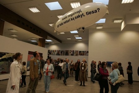 The gum airship of Kristina Inčiūraitė flying near the ceiling of the Picture Gallery may be called a laconic generalisation of Vilnius artists' presentation in Kaunas – the golden thought of the CAC cashier Ala is written brightly on it “When you do not think, perhaps you have nothing to say, right?“.