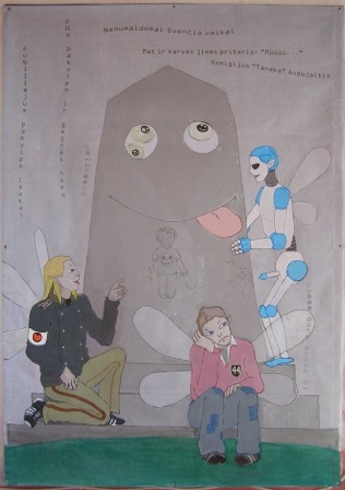 The exhibition “Transflat” organised at Kaunas gallery Meno Parkas and named according to the analogy with the Japanese post-modernism movement “Superflat” is formed of ten photographed paintings. Eclecticism of colours, composition and themes prevails – huge formats of paintings typical of television press down information into colourful stories which mock the status of the society in various languages.