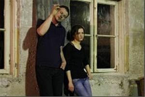 The director is inclined to speak about the common experience of people. Making the content of the drama universal, he chooses an abstract minimalistic stage design and concentrates attention on the relations of conflicting people. In the first part of the performance A.Areima focuses on biting dialogues of actors and shows the conflict of two people – brother and sister.