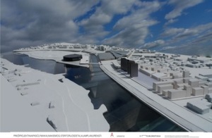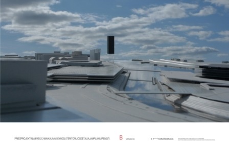 Variant A. As the territory is located in the axis of the Nemunas, the appearance of a public space would be positive here. The square – terrace would be on the level of the third floor of the adjacent garages, it would lower towards the old town. The perimeter of buildings near the square would increase – more buildings would have good views. The dominants would be 4 “books” – buildings of 18-20 floors. The conversion of Kauno Energija AB buildings into a contemporary art centre is planned. A zone of 5-storeyed multi-apartment houses is designed in the second plan from the river, and a zone of 6-8-storeyed offices near them.