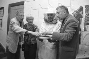 Presentation of www.kamane.lt at Kaunas Artists’ House on October 3, 2005. The composer Giedrius Kuprevičius, theatre critic Vida Savičiūnaitė and actor Viktoras Valašinas are treated by the “beekeeper” Antanas Kneziauskas. Photo of Zenonas Baltrušis