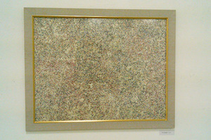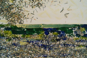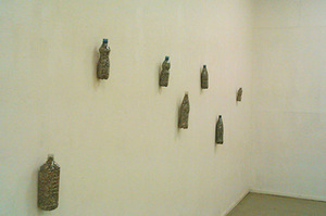 After the jars and water bottles artist moves to paintings. But, of course, A. Andriuškevičius would not be A. Andriuškevičius if he would not add other techniques to painting. Five paintings which names, if put together, end up in a phrase: "There will be no...Time...To rejoice...After...We get old..." (Taken from a Lithuanian folk song "Rejoice"). In these five works artist also uses paper shreds, this time gluing them to the canvas. He uses paint as well. This means that the work was painted and glued together. Paper shreds, that are not fully glued to the canvas create a three-dimensional impression and provide a possibility of participation for the viewer.