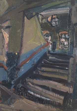 „Laiptai tamsoje“ – paveikslas, įkūnijantis apibendrintą „laiptinių“ periodo patirtį. Įdomi drobės spalvinė struktūra. Viršutiniame paveikslo sluoksnyje spalvos atviresnės, kontrastuoja tarpusavyje, sudarydamos įtampą. Tačiau jos dengia gilesnius sluoksnius – tuos, kuriuose glūdi tamsios, sodrios spalvos, lyg praėjusio laiko patina. Tarp pirmojo spalvų sluoksnio ir to, gilesnio, atsiranda nauji kontrastai ir įtampa, lyg tarp esamo „ dabar“ ir to, kas jau buvo praeityje. Taip kuriama nauja įtampa ir keista gili erdvė.