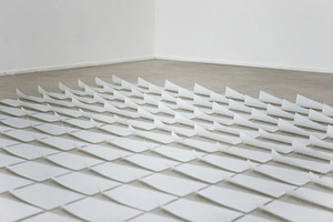 „Nepasakyti“ – tai 380 itin plonų matinio stiklo lakštų, simetriškai suguldytų ant galerijos grindų. Akivaizdu, kad šie lakštai – mums įprastų A4 formato popieriaus lapų imitacijos, tad akis iškart fiksuoja medžiagos ir formos neatitikimą. Tokią meninę strategiją, kai objekto, tikrovėje susijusio su tam tikromis medžiagomis, „dublikatas“ gaminamas iš visai kito pobūdžio materijos, menotyrininkas Alfonsas Andriuškevičius yra pavadinęs medžiagos inversija. Lietuvių menininkai medžiagos inversiją kūryboje yra pasitelkę ne kartą (verta paminėti Dariaus Basčio minkštąsias skulptūras, Gedimino Urbono „Lagaminą“), tačiau jos taikymo pradininkai – šiuolaikinio meno pionieriai svetur. Rezonansą dar XX a. 7 deš. sukėlė Claeso Oldenburgo minkštos įvairių kasdienių objektų ar maisto produktų skulptūros, ironiškai reflektavusios tuometę vartojimo kultūrą JAV. Na, o iš jaunesnių šiuolaikinių menininkų vertėtų paminėti Danielį Arshamą, kuris šiandienio vartojimo daiktus (fotoaparatą, telefoną, sportinius batelius) paverčia gipso skulptūromis, tokiu būdu skatindamas į dabartį žiūrėti iš ateities perspektyvos.