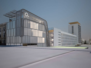 Manyčiau, automobilių aikštelę reikėtų spręsti kartu su pastatu. Juk horizontalaus tūrio funkcija irgi intensyvėja. Cokolio atvėrimas pozityvus, bet savo sklype, kad nedarytų įtakos aikštei.