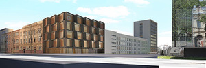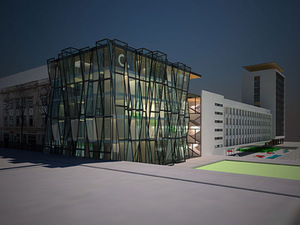 Variantas 02 – dinamiška aikštės pabaiga. Metalo apdaila fasade galėtų susišaukti su V.Minkevičiaus projektuotu pastatu Putvinskio gatvėje, BLC pastatu.