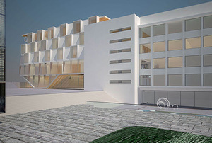 Variantas 05 – kvadratinė ritmika sietųsi su esama stilistika. Pastatas siūlomas baltas, integruotas į šaliai esantį.